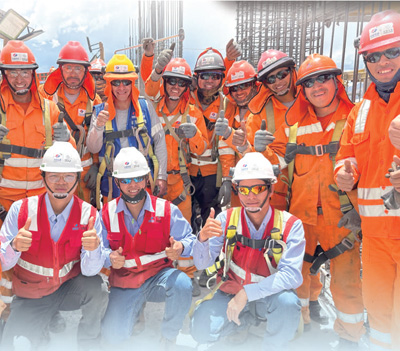 在中企承建的秘魯庫斯科聖安東尼奧國立大學升級改造項目施工現場,中秘兩國建設者合影。
