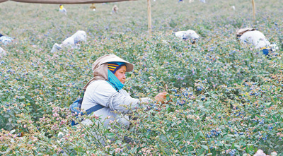 秘魯特魯希略市一家農場內,工人們在採摘藍莓。
