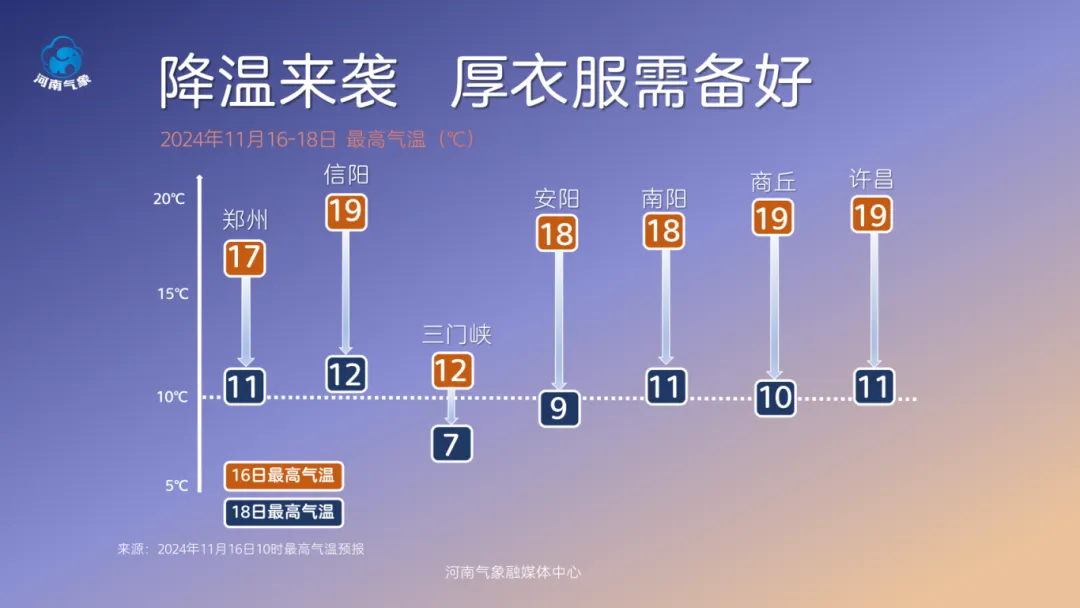 受冷空氣影響,明天到18日,全省偏北風3到4級,氣温顯著下降,18日全省大部最高氣温較前期下降8到12度。
