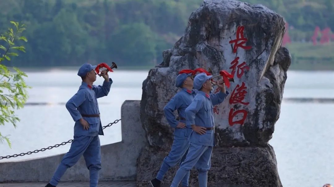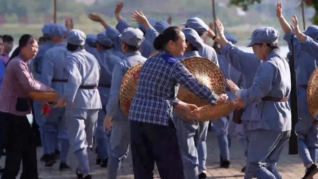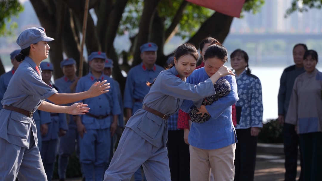在江西于都河畔的大榕樹下,情景劇《告別》一次次上演,重現1934年秋天,紅軍從於都集結出發時,于都河畔軍民依依惜別,“母送子”“妻送郎”“託孤跪別”的場景。