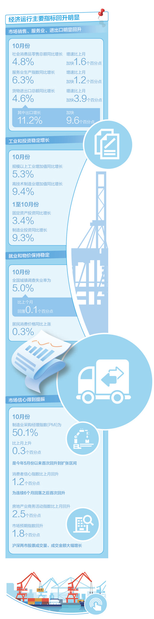 “近期,相關部門加力推出一攬子增量政策,經濟運行回升勢頭增強,主要指標回升明顯,市場信心改善。”付凌暉用“三個回升、兩個穩定、一個提振”概括10月份經濟運行情況。