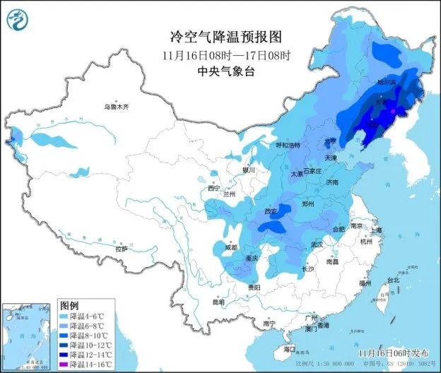 中央氣象台最新預報顯示,未來三天(16~18日),受強冷空氣影響,中東部地區將迎來一次大範圍大風降温天氣過程,氣温普遍下降6~10℃,東北地區等地的部分地區降幅可達14℃以上 。