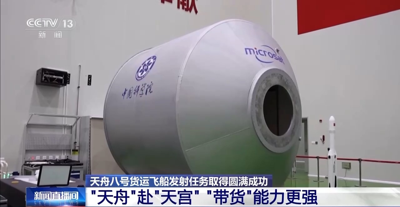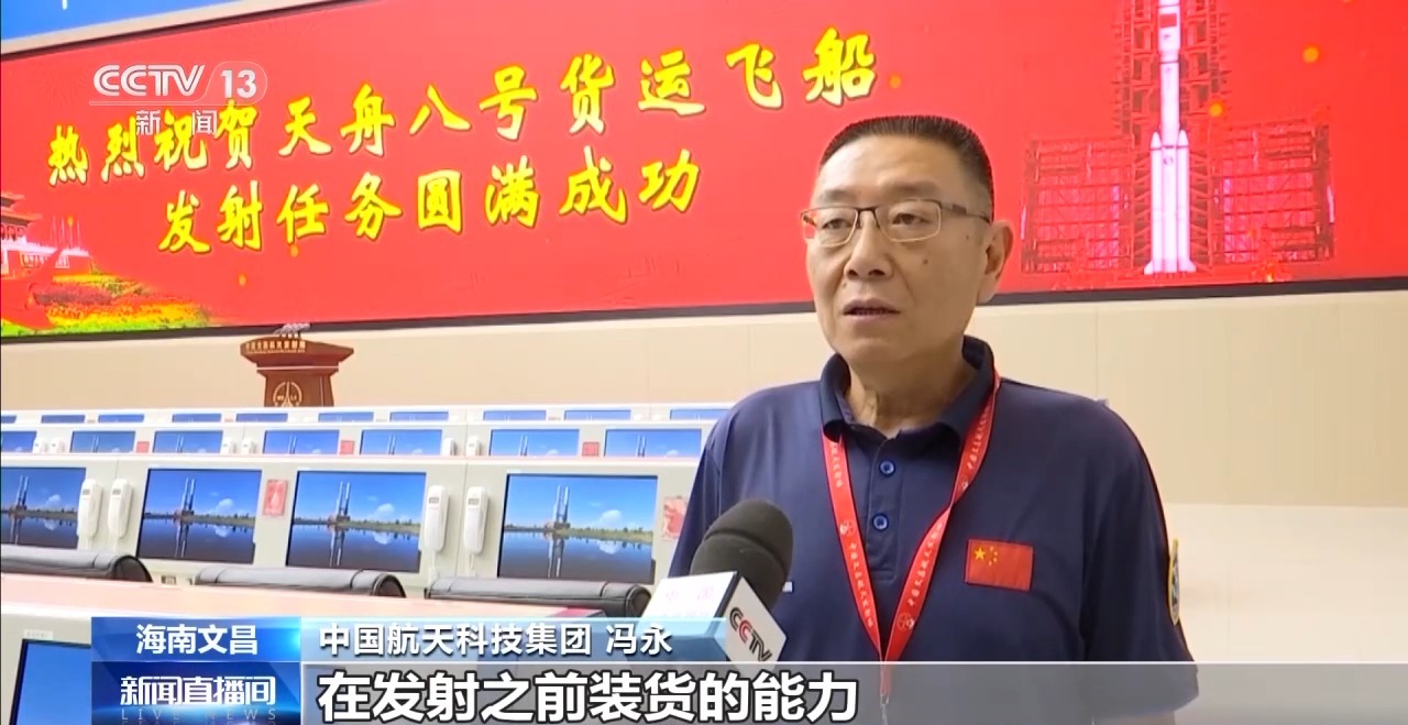 *中國航天科技集團 馮永:*天舟八號貨運飛船相對於天舟七號,在發射之前裝貨的能力較以前有很大的提升,那麼主要是為了運送一些時效性很強的貨物,為空間站在軌進行科學實驗提供了一個很大的技術支撐。比如説一些生物製劑,細胞裝置培養等等這樣,對的一些科學項目有很大幫助。