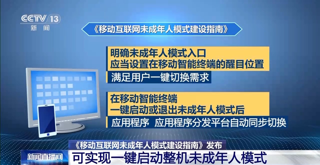 為了降低操作難度,《指南》明確,未成年人模式入口應當設置在移動智能終端的醒目位置,滿足用户一鍵切換需求。在移動智能終端一鍵啓動或退出未成年人模式後,應用程序、應用程序分發平台自動同步切換。