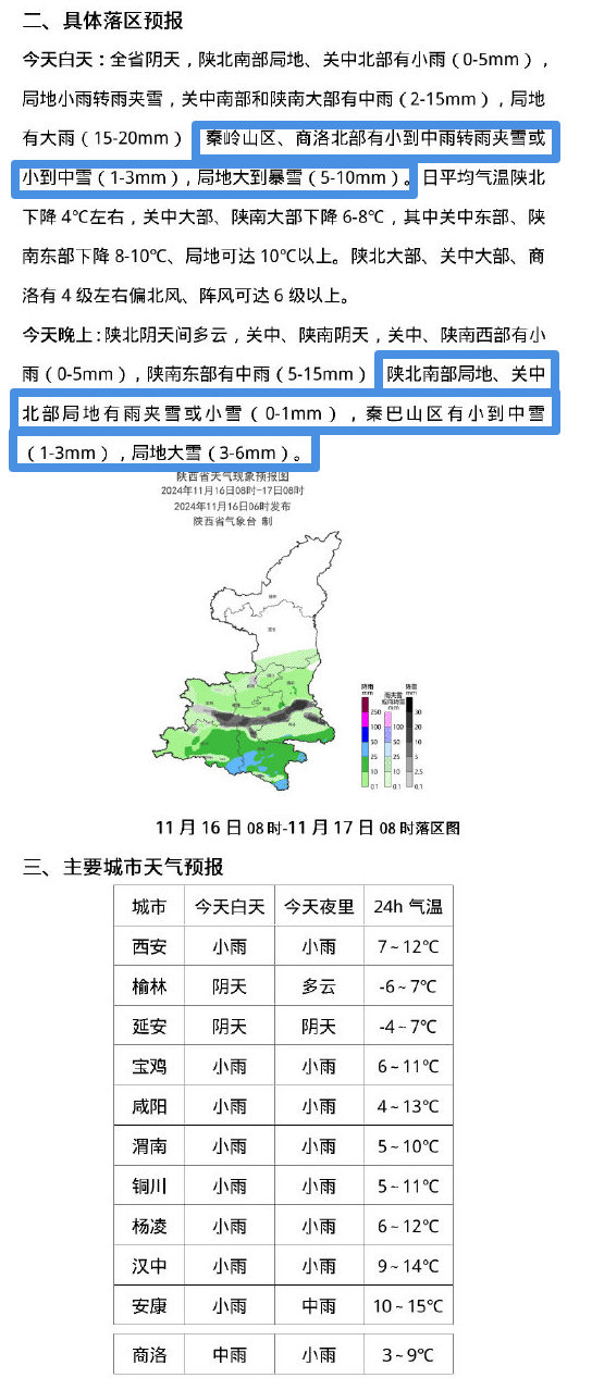 17日:陝北陰天間多雲,關中、陝南陰天,關中有小雨(0~5毫米),陝南有小到中雨(4~15毫米),關中北部局地有雨夾雪或小雪,秦巴山區有小到中雪,局地大雪。