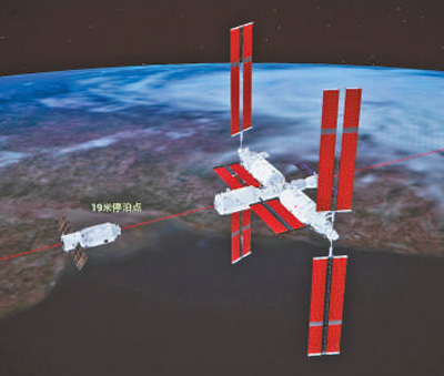 11月16日在北京航天飛行控制中心拍攝的天舟八號貨運飛船與空間站組合體完成交會對接的模擬圖像。