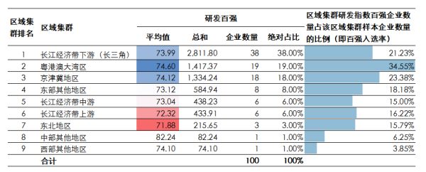從集羣的視角來看,長江經濟帶下游(長三角)地區和粵港澳大灣區成為兩大亮點。長三角地區以2811.80分的研發指數總和及38家上榜企業數量,穩居榜首。而粵港澳大灣區則以74.60分的研發指數平均值和34.55%的百強入選率,遙遙領先。兩大區域的優異表現,為中國醫藥產業的發展注入了強勁動力。