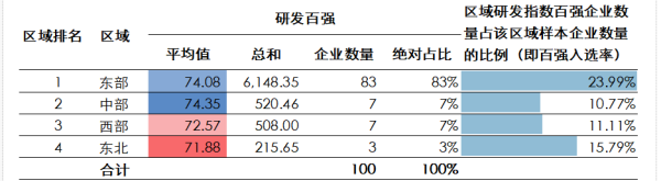 從區域視角來看,2023年度中國醫藥企業研發指數百強榜單中,東部地區以6148.35分的總分,83家上榜企業數量,23.99%的百強企業入選率,穩居榜首,展現出強大的研發實力。東部地區在醫藥研發領域的領航者地位,不容置疑。然而,中部地區以74.35分的研發指數平均值勇奪桂冠,彰顯了其強勁的研發實力。東北地區雖在數量上不佔優勢,但其15.79%的百強入選率僅次於東部地區,也預示着其巨大的發展潛力。