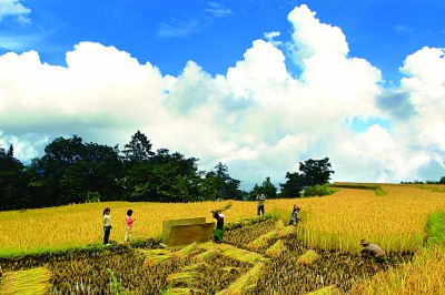 豐收時節,村民們在哈尼梯田割稻打穀。金家茂攝 圖片由北京國際攝影周“中國稻作文化影像展”提供