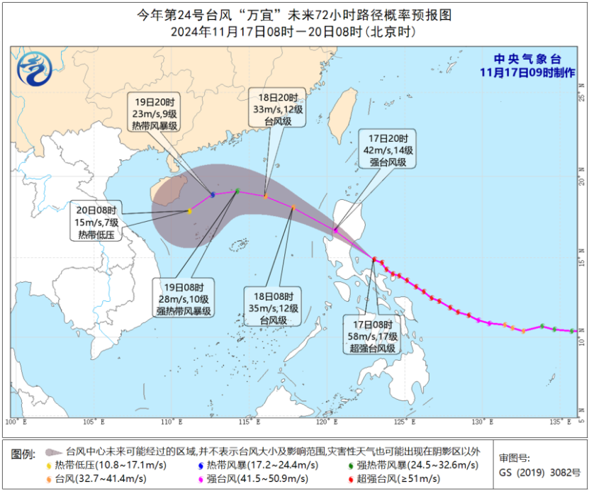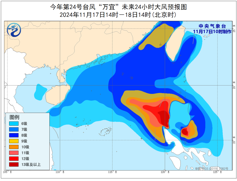 今年第24號颱風“萬宜”(超強颱風級)的中心今天(17日)上午8點鐘位於菲律賓馬尼拉偏東方向約220公里的洋麪上,就是北緯14.9度、東經123.0度,中心附近最大風力17級(58米/秒),中心最低氣壓為925百帕,七級風圈半徑150-250公里,十級風圈半徑80-110公里,十二級風圈半徑50公里。