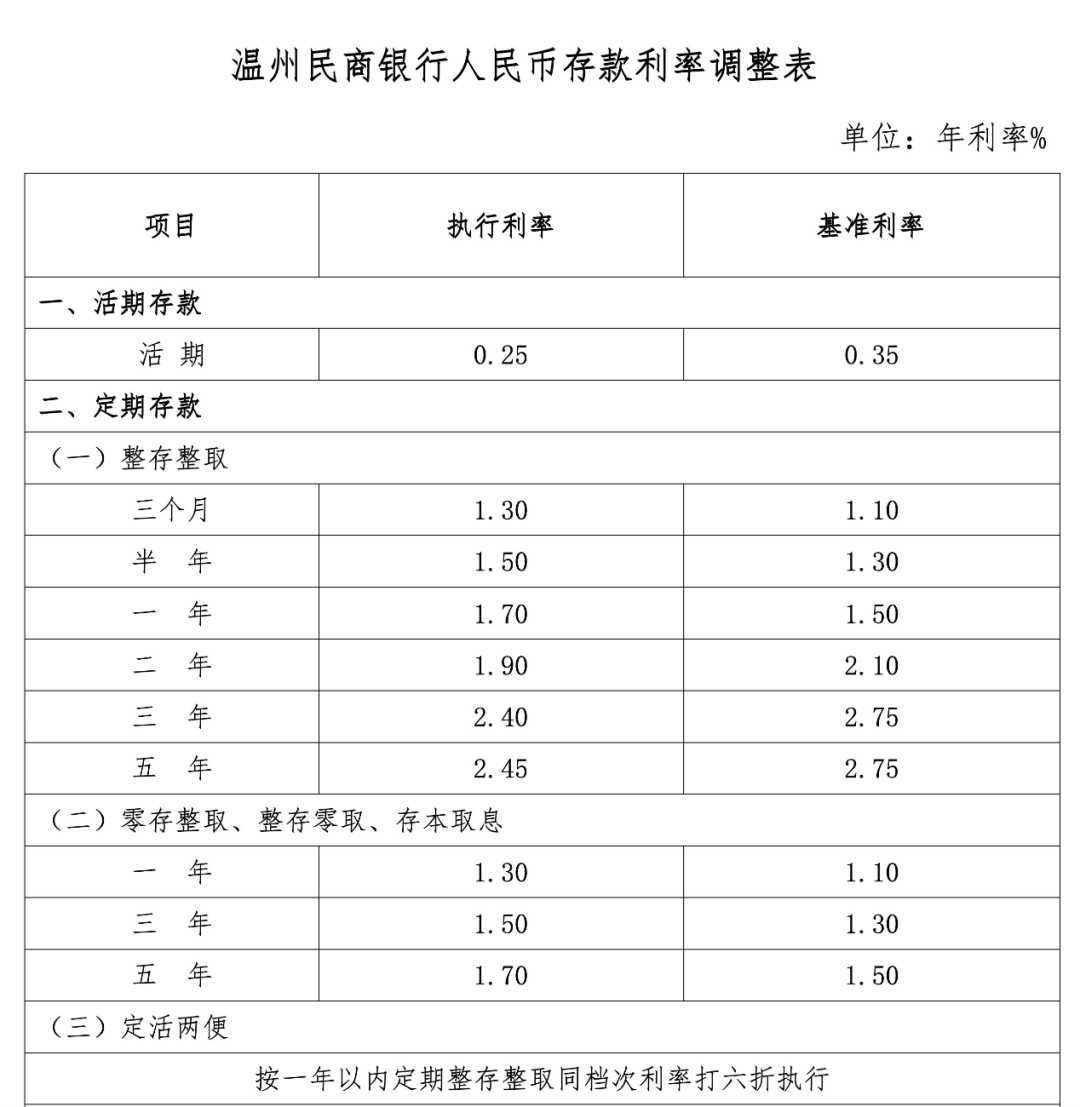 同時,温州民商銀行在官網更新了人民幣存款利率調整表,自11月15日起執行。其中,三年期和五年期整存整取年化利率分別降至2.4%和2.45%。