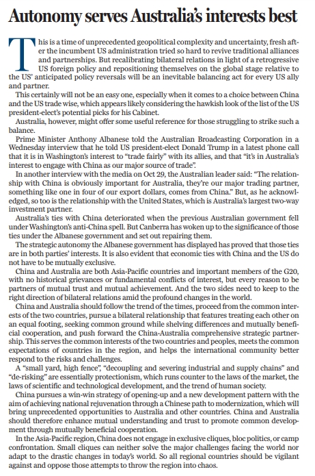 澳大利亞總理阿爾巴尼斯13日在接受澳大利亞廣播公司採訪時表示,他在近期與美國當選總統特朗普電話溝通時稱,與盟友開展“公平貿易”符合華盛頓方面的利益,而“與作為主要貿易對象的中國往來,也符合澳大利亞的利益”。