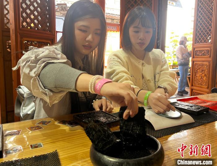 圖為朱珈儀(左一)等台青在大理南詔喜城體驗甲馬非遺技藝。時文枝 攝