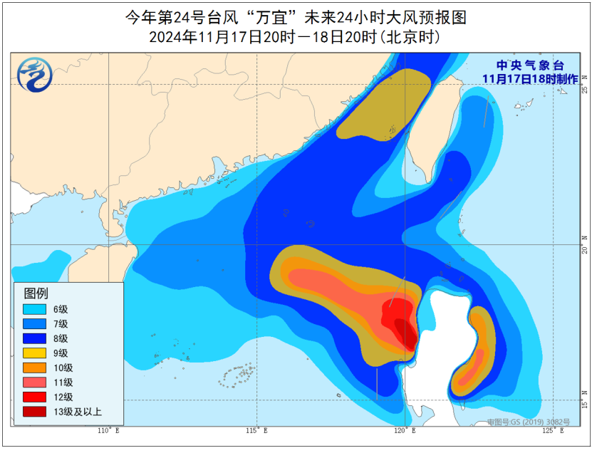 *大風預報:*17日20時至18日20時,受冷空氣和“萬宜”的共同影響,南海北部和中部、巴士海峽、台灣海峽、台灣以東洋麪、東沙羣島、西沙羣島、福建沿海、台灣島沿海、廣東沿海、海南島東部和南部沿海將有6-8級,陣風9-10級的大風,其中台灣海峽、巴士海峽西南部部分海域、南海中部和北部的偏東海域風力有9-10級,陣風11-12級,颱風中心經過的海域或地區風力有11-13級,陣風14-15級。