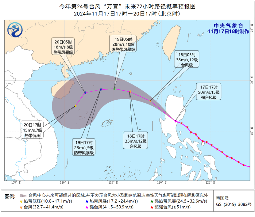 中央氣象台11月17日18時繼續發佈颱風藍色預警*:*