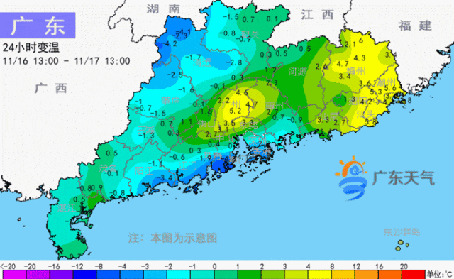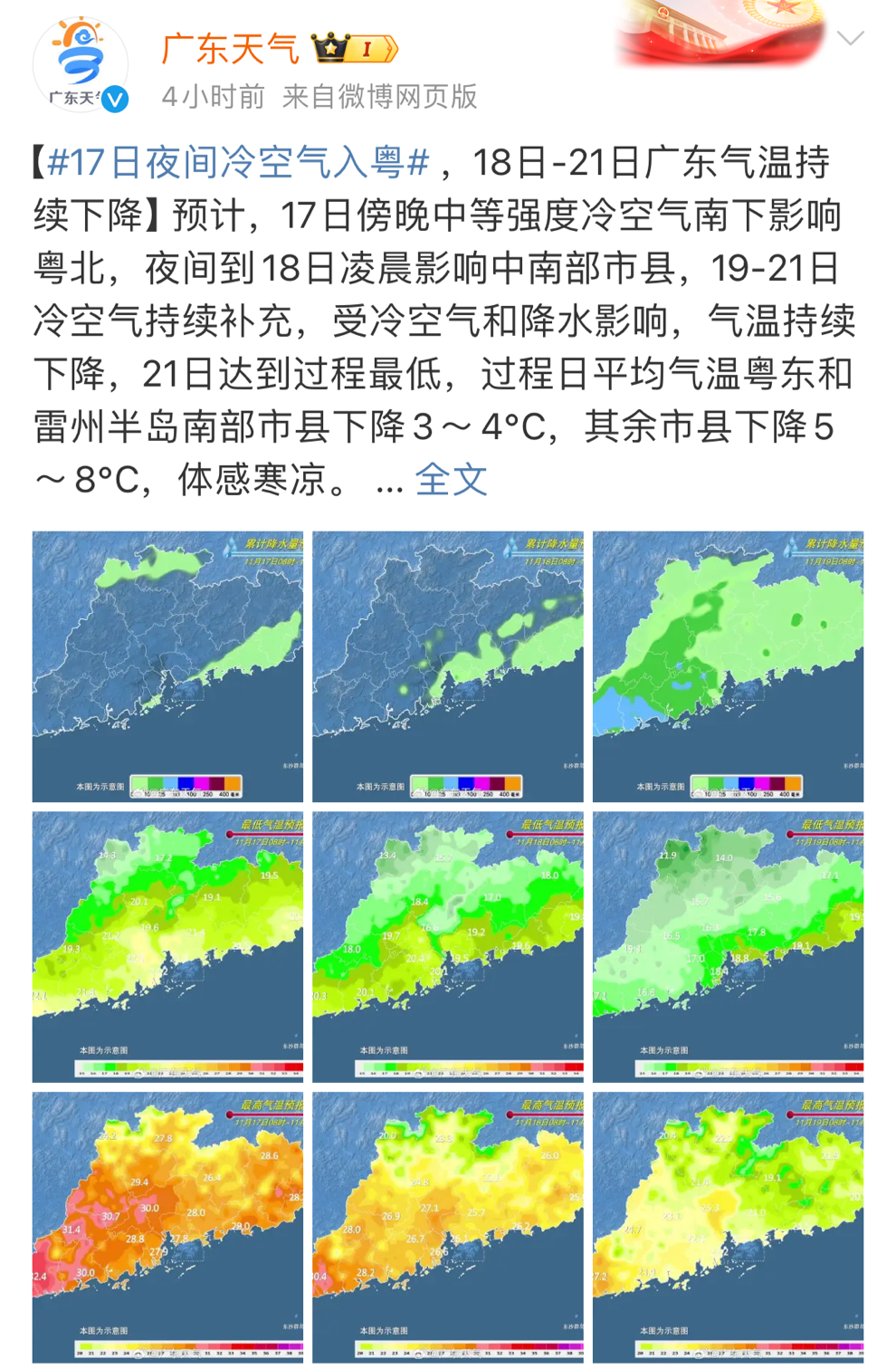 預計11月17日傍晚中等強度冷空氣南下影響粵北,夜間到18日凌晨影響中南部市縣,11月19日-21日冷空氣持續補充,受冷空氣和降水影響,氣温持續下降,11月21日達到過程最低,過程日平均氣温粵東和雷州半島南部市縣下降3-4℃,其餘市縣下降5-8℃,體感寒涼。