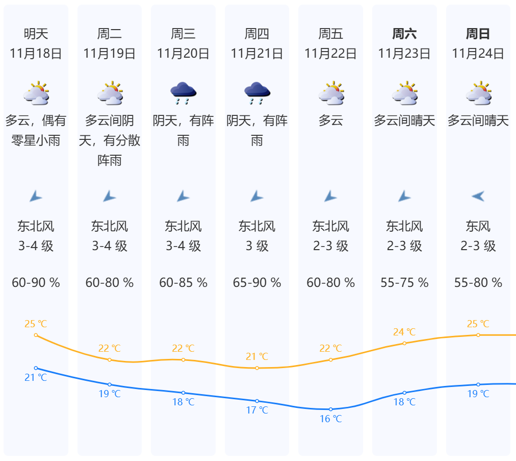 預計11月18日-19日我市多雲間陰天,有分散小雨,沿海、高地和海區最大陣風8級左右,氣温下降,其中19日最低氣温將降至20℃以下。