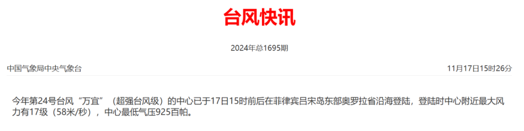 據中央氣象台消息,今年第24號颱風“萬宜”(超強颱風級)的中心已於11月17日15時前後在菲律賓呂宋島東部奧羅拉省沿海登陸,登陸時中心附近最大風力有17級(58米/秒),中心最低氣壓925百帕。