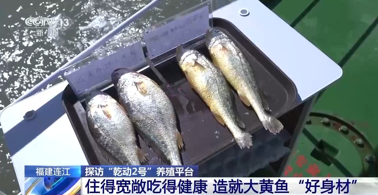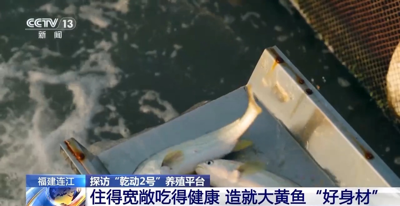 有活力,也是深遠海大黃魚的一個特點,它們會比近岸養殖的大黃魚健康很多。因為它們住得好,近岸養殖1立方米的水體裏有20至30尾魚,而在“乾動2號”深遠海養殖平台上,這個數要除以3。
