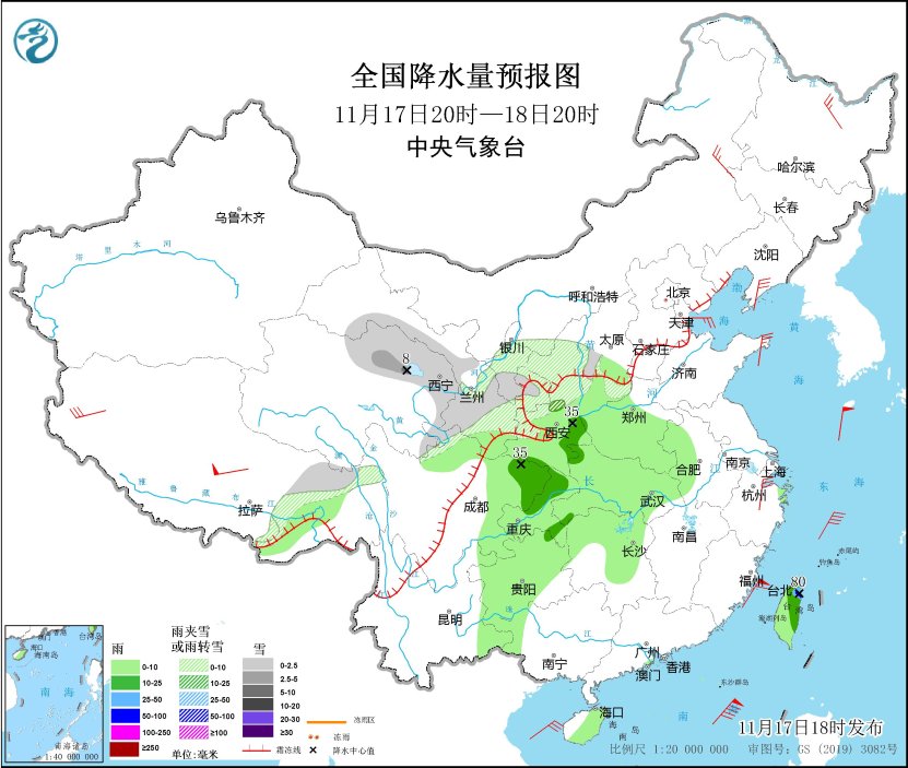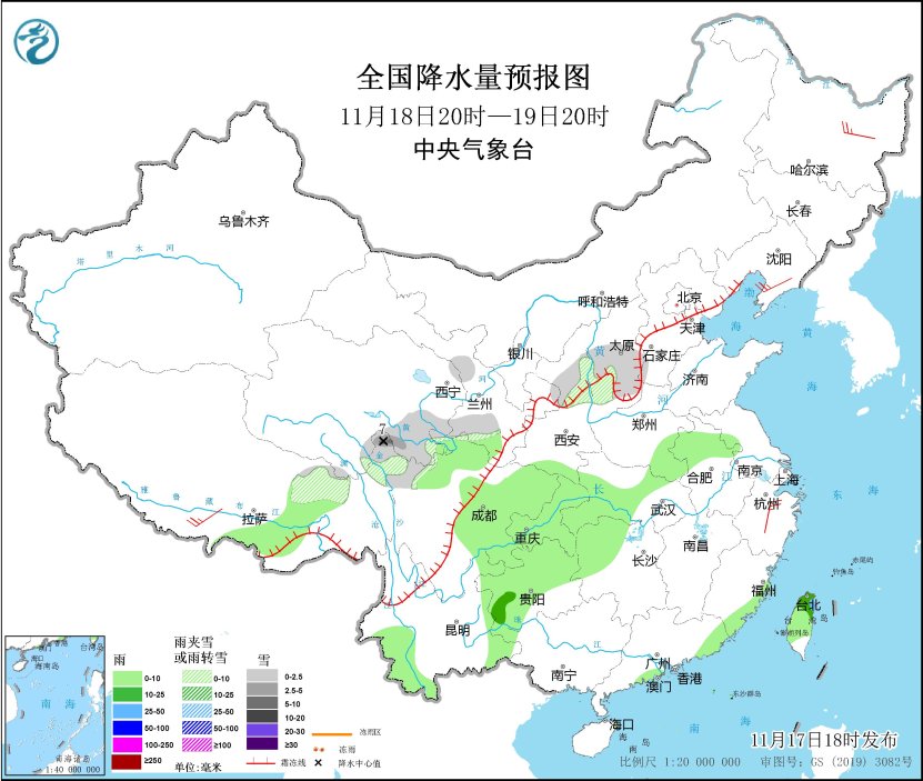 17日夜間至18日,冷空氣繼續影響中東部地區,東北地區東部、黃淮東部、貴州東部、江南、華南北部等地氣温下降4~6℃,部分地區降温幅度達8℃以上,最低氣温0℃線將南壓到華北南部、西北地區東南部一帶;並伴有4~6級大風、陣風7~8級;西北地區東南部、華北西南部、黃淮西部、江漢、江淮西部、江南以及西南地區東部等地將有小到中雨,局地大雨;甘肅河西和南部、青海東部和北部、寧夏、陝西中北部、山西西部、川西高原北部等地有小到中雪或雨夾雪,局地有大雪。
