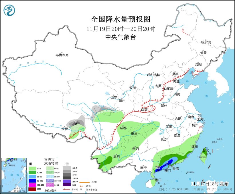 圖5 全國降水量預報圖(11月19日20時-20日20時)