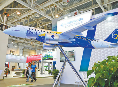 在廈門舉行的2024金磚國家新工業革命展巴西展位展出的E190-E2飛機模型。