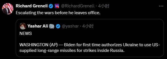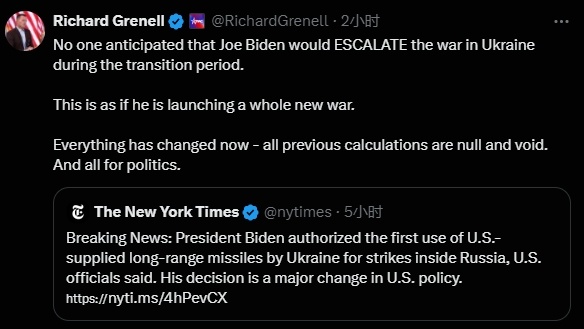 對媒體的這一報道,目前美國候選總統*特朗普的團隊方面暫未有正式回應。*但特朗普最親密的外交政策顧問之一理查德·格雷內爾批評了這一決定。格雷內爾在回應這一消息的社交媒體發帖中稱:“在他(拜登)離任之前,戰爭會升級。”“誰也沒有預料到拜登會在過渡時期升級烏克蘭戰爭。這就像他正在發動一場全新的戰爭。現在一切都變了——之前的所有算計都化為泡影。一切都是為了政治。”