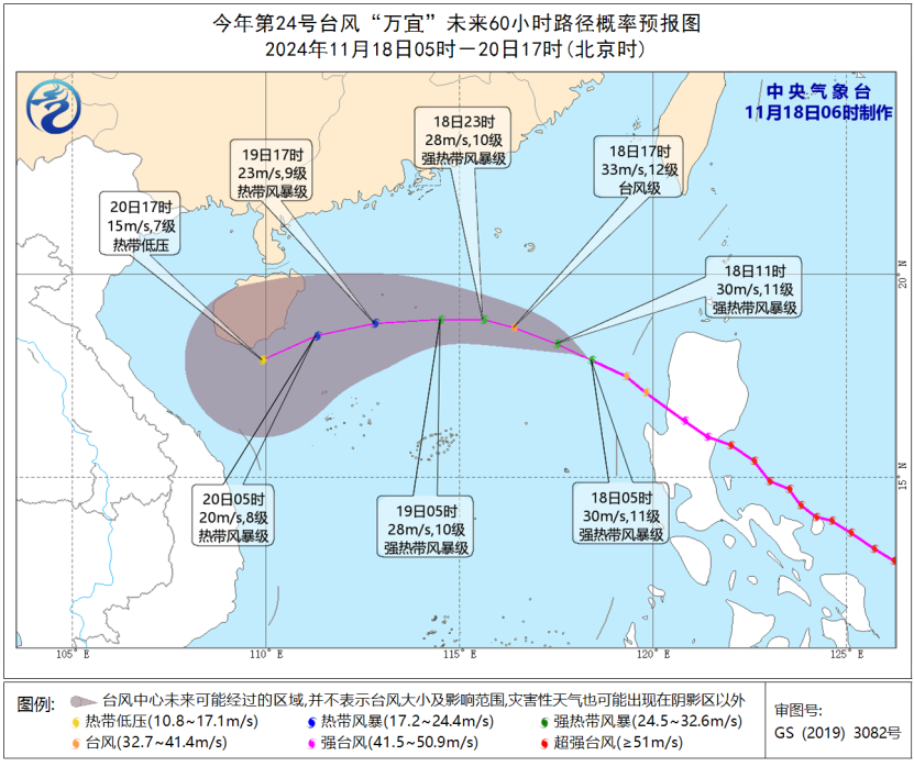 受冷空氣和“萬宜”的共同影響,今天白天至夜間,南海中北部、華南沿海等地將有6~8級,陣風9~10級的大風,台灣海峽、南海北部風力有9~10級,陣風11~12級,颱風中心經過的海域或地區風力有11~12級,陣風13~14級。19-20日,華南地區將有較強降雨,廣東、廣西中東部、海南島等地部分地區有中到大雨,局部暴雨。建議上述地區公眾密切關注當地氣象部門發佈的最新台風動態和風雨預報,注意防範較強風雨天氣對出行交通等的不利影響,並警惕局地強降雨可能引發的次生災害。