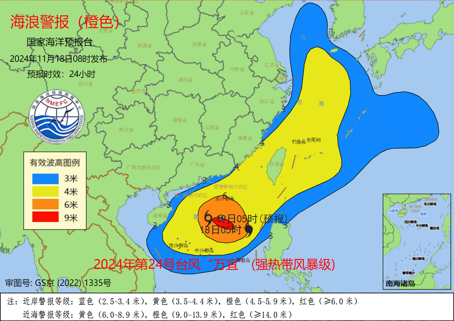 海浪方面,預計11月18日中午到19日中午,南海北部將出現6到9米的狂浪到狂濤區,台灣海峽將出現4到6米的巨浪到狂浪區,黃海南部、東海將出現3到5.5米的大浪到巨浪區,近海海域海浪預警級別為橙色;*福建近岸海域將出現3到4.5米的大浪到巨浪,該近岸海域海浪預警級別為橙色,廣東東部、海南東部近岸海域將出現2.5到4米的大浪到巨浪,該近岸海域海浪預警級別為黃色,*江蘇南部、上海、浙江近岸海域將出現2到3.4米的中浪到大浪,該近岸海域海浪預警級別為藍色。