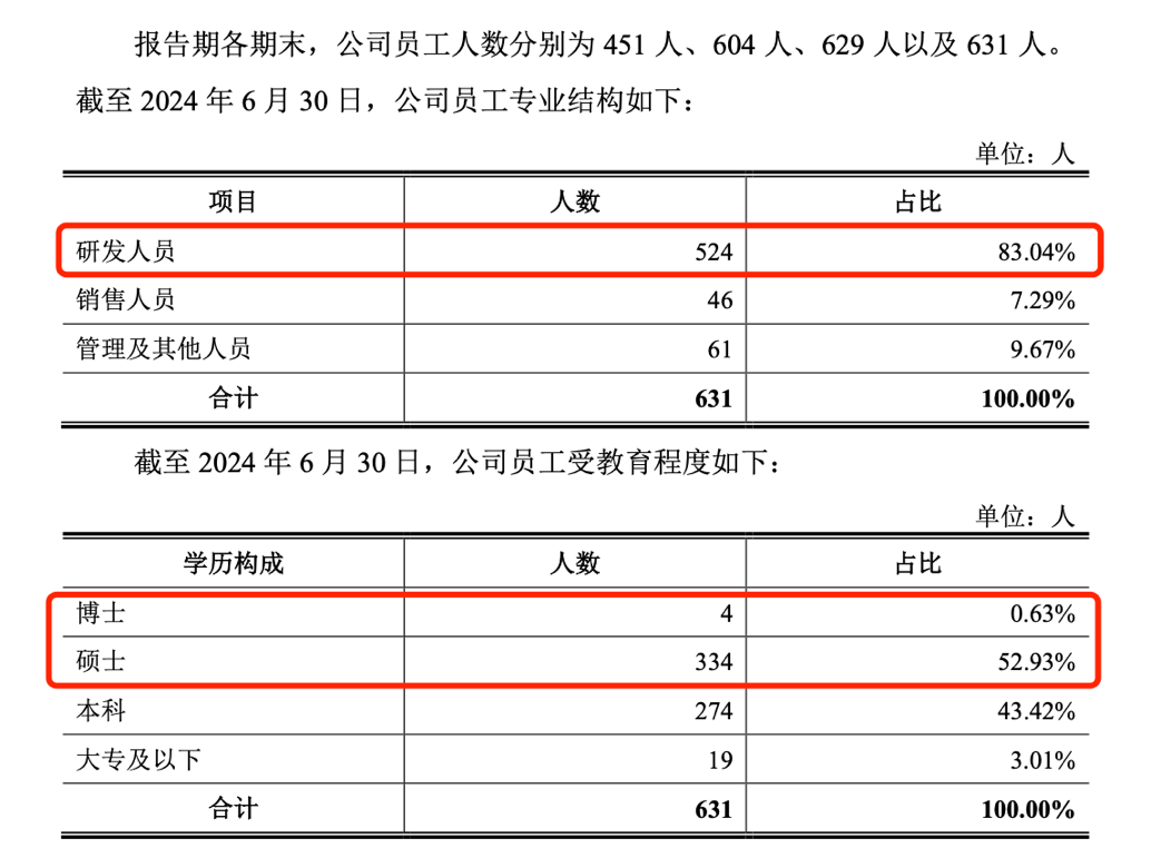 公司招股書顯示,聯芸科技技術人才佔比很大,人才密度高。截至2024年6月,公司研發人員佔總員工比例達到83.04%。本網記者還注意到,聯芸科技全公司631名員工,而碩博學歷的員工就有338人,佔比超過50%;本科學歷以下的員工僅19人,佔比僅3%。
