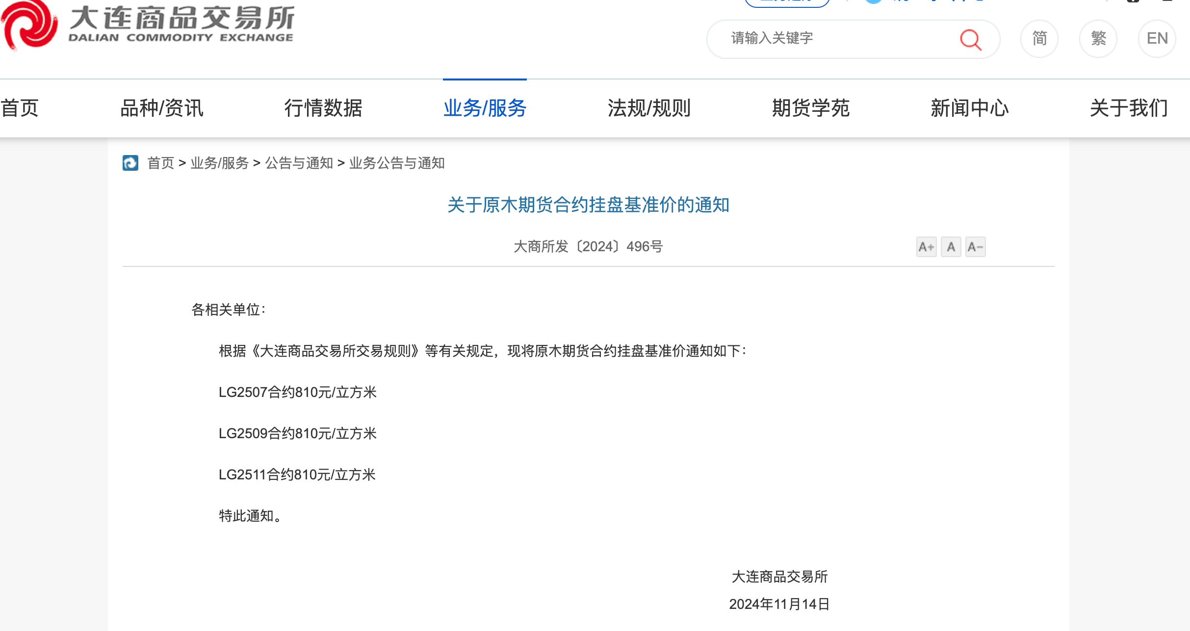 【環球網金融綜合報道】11月18日,大連商品交易所(下簡稱大商所)正式推出原木期貨交易,11月19日起原木期權上市交易。其中,原木期貨LG2507、LG2509、LG2511合約掛牌基準價均為810元/立方米。