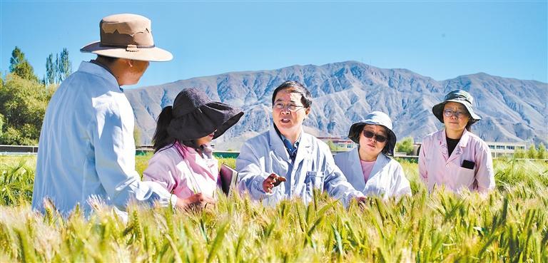 8月16日,山東援藏農業專家、日喀則市農牧業科學研究推廣中心副主任張斌(中)在青稞試驗田裏指導種植。經濟日報記者 袁勇 攝