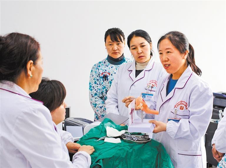 4月17日,山東援藏醫療專家、日喀則市婦幼保健院婦女保健部主任孔豔(右一)在現場帶教。在山東援藏的幫扶下,該院成功創建二甲醫院。經濟日報記者 袁勇 攝