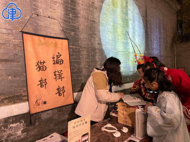 而在另一位天津名人——李叔同的故居處,夜色掩不去這裏的熱鬧,“叔同之夜”正精彩上演。遊客領到一本雜誌,上面有一篇還未完成的“李叔同專訪”,遊客作為“撰稿人”,需要通過對故居的深度遊覽,把這篇專訪寫完,並獲得相應的獎勵。