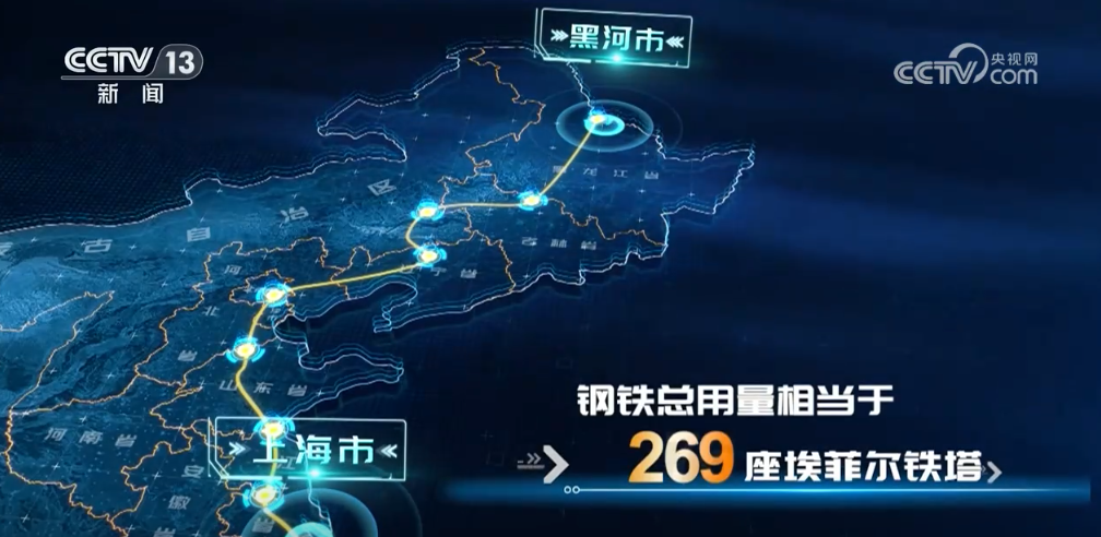 管道全長5111公里,北起黑龍江省黑河市,途經9個省、自治區、直轄市,南至上海。其中,新建管道3371公里,鋼鐵總用量相當於280座埃菲爾鐵塔。