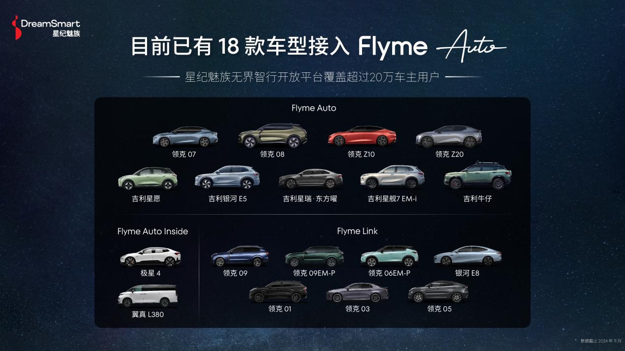 據介紹,星紀魅族早在 2021 年就開始切入智能出行賽道,依託十幾年的操作系統自研經驗打造 Flyme Auto 。“截至目前,Flyme Auto 已經完成 1000多個功能的開發,覆蓋超過 20 萬車主用户。”據劉衍介紹,“ Flyme Auto 已接入領克、吉利銀河、極星等多個品牌的 18 款車型,是目前搭載上市車型最多的智能座艙操作系統,使星紀魅族成為中國頭部智能座艙提供商之一。”