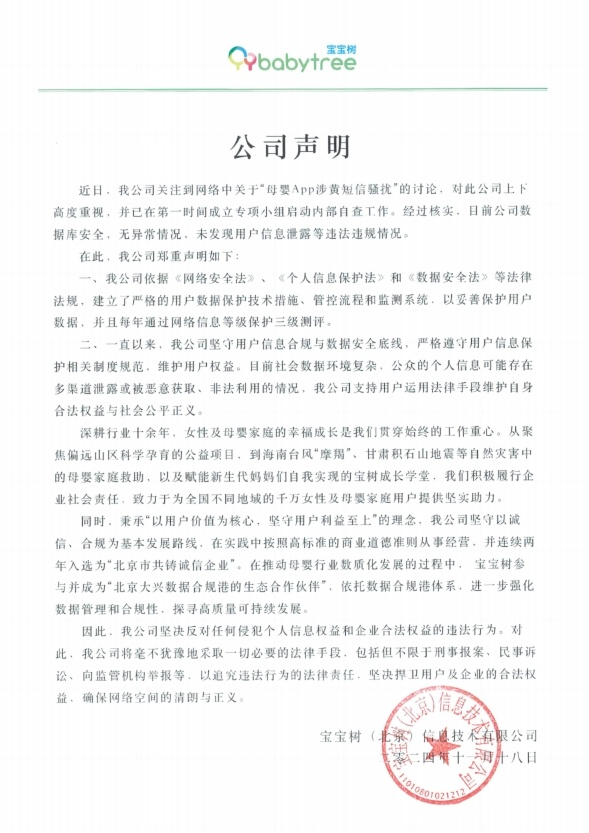 【環球網科技報道 記者 李文瑤】11月18日,針對網絡中關於“母嬰App涉黃短信騷擾”一事,寶寶樹發表聲明稱,公司關注到相關討論,並已在第一時間成立專項小組啓動內部自查工作。經過核實,目前公司數據庫安全,無異常情況,未發現用户信息泄露等違法違規情況。