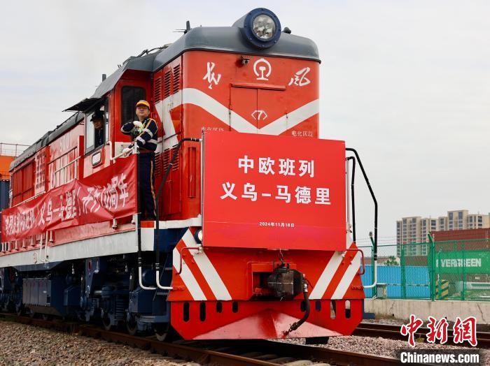中新社浙江義烏11月18日電 (尹倩芸 董易鑫)一趟滿載110個標準箱日用百貨、汽車配件、機械設備等出口貨物的中歐班列18日從鐵路義烏西站駛出,駛往逾1.3萬公里外的西班牙馬德里。當日,義烏中歐班列迎來開行十週年。