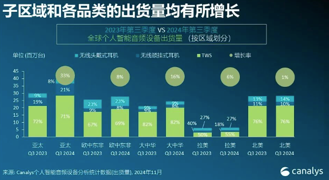 報告認為,這標誌着該市場連續第三個季度迎來上升態勢,表明其已脱離2023年遭遇的困境,實現持續回升。普遍性的增長令每個主要的子區域都有所獲益。所有主要的產品類別均已實現兩位數的增速,全球市場前景看好。其中,新興的開放式耳機和中等規模的廠商做出了有力貢獻。