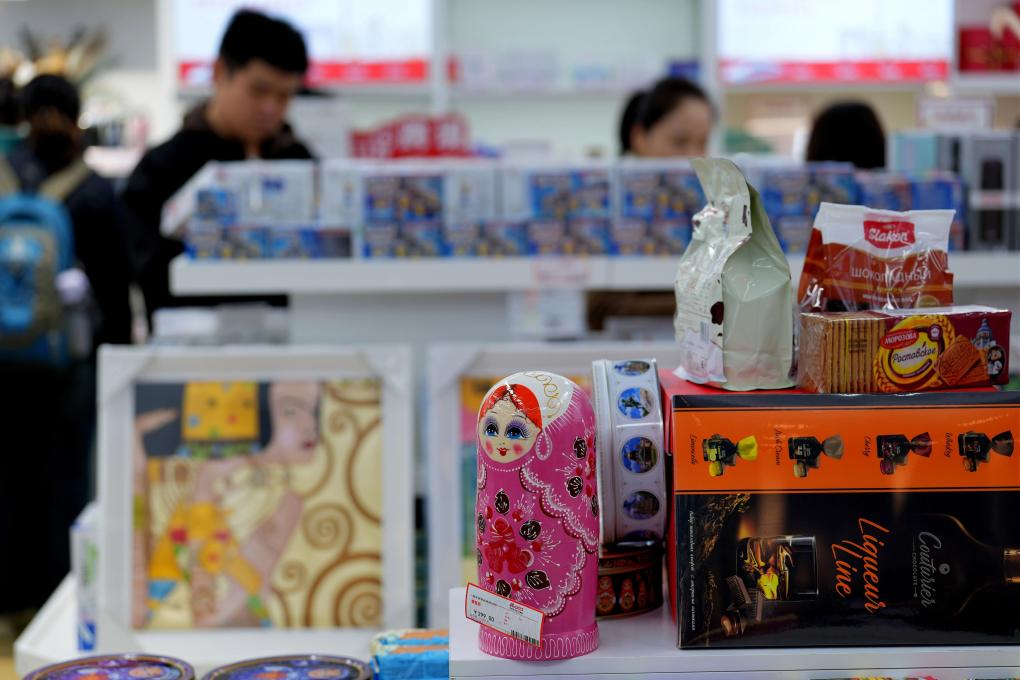 11月17日,旅客在湖北漢口車站中歐班列進口商品保税店選購商品。新華社記者 邢廣利 攝