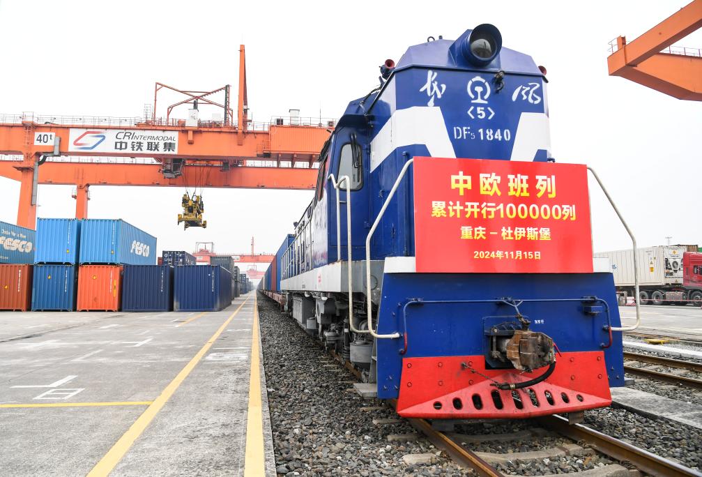 11月15日,第10萬列中歐班列——X8083次中歐班列(重慶—杜伊斯堡)在重慶團結村中心站準備發車。新華社記者 王全超 攝