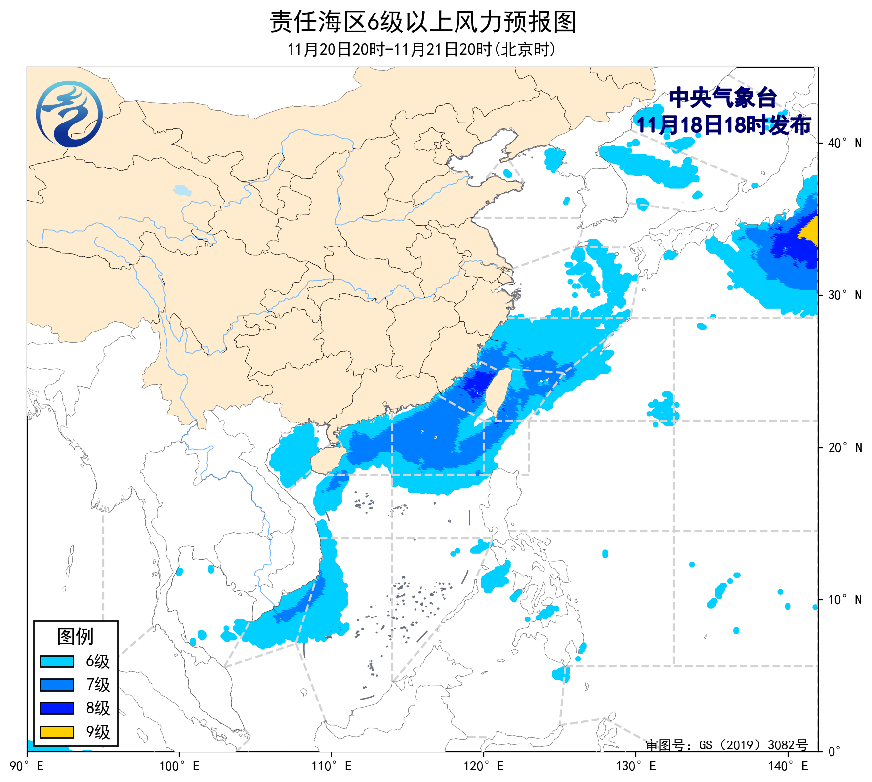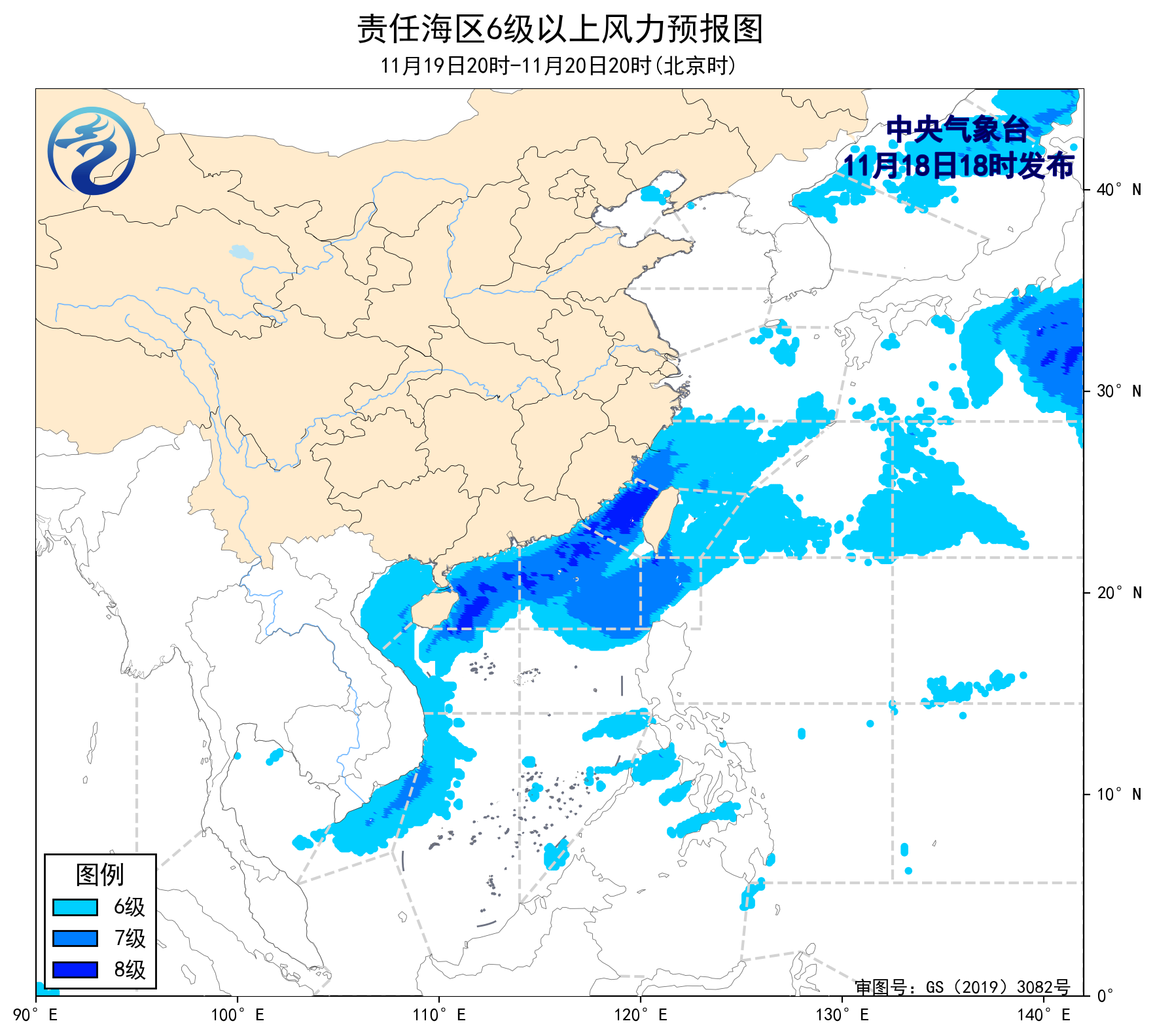 19日20時至20日20時,東海南部、台灣海峽、台灣以東洋麪、巴士海峽、南海中北部和西部海域、瓊州海峽、北部灣將有6~8級、陣風9級的大風。