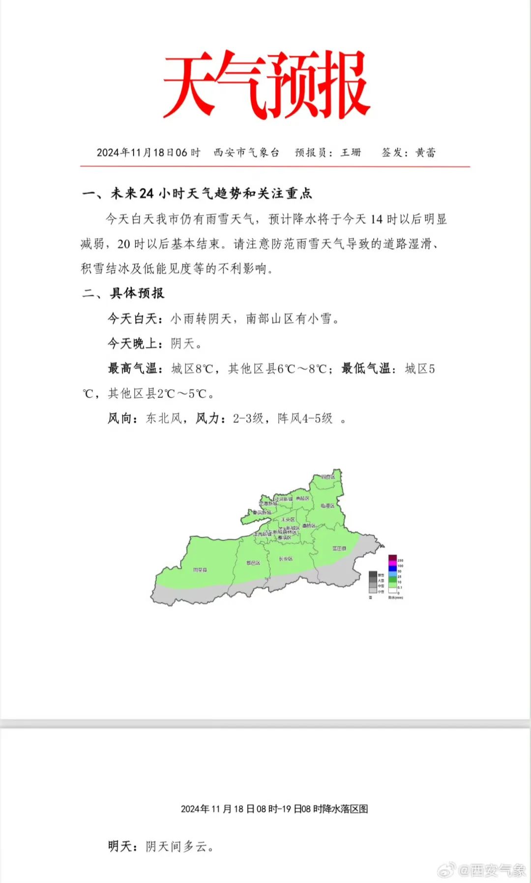 *24日:*全省陰天,陝北、秦嶺山區有小雪或雨夾雪,關中、陝南有小雨或雨夾雪。日平均氣温陝北西部下降4~6℃。
