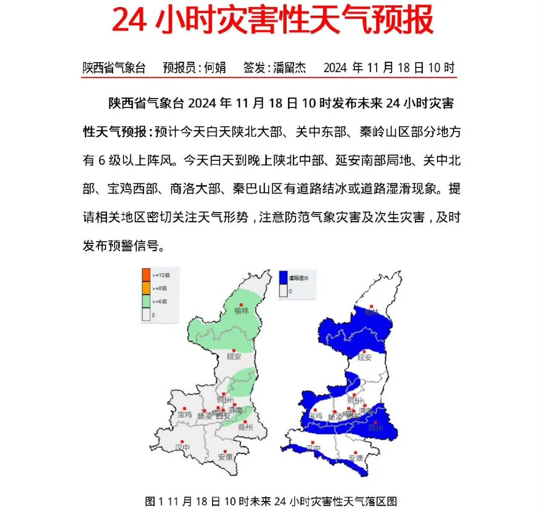 預計今天(11月18日)白天陝北大部、關中東部、秦嶺山區部分地方有6級以上陣風。今天白天到晚上陝北中部、延安南部局地、關中北部、寶雞西部、商洛大部、秦巴山區有道路結冰或道路濕滑現象。提請相關地區密切關注天氣形勢,注意防範氣象災害及次生災害,及時發佈預警信號。