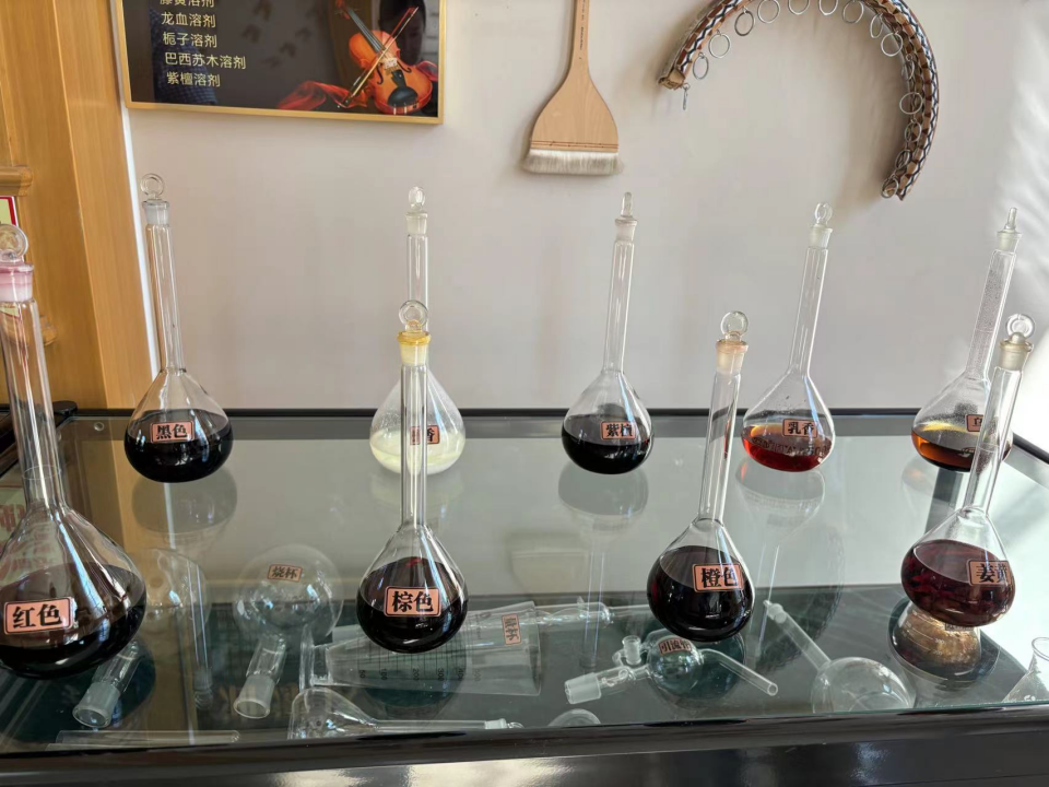 但現在東高村鎮的提琴,都用上了天然的“綠色漆”。華東樂器的展櫃裏,擺放着“薑黃”“紫檀”“松香”等各色油漆玻璃瓶。