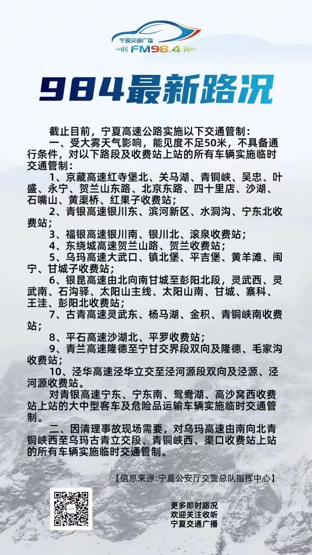 由於能見度低,銀川警方先後發佈臨時交通管制信息↓
