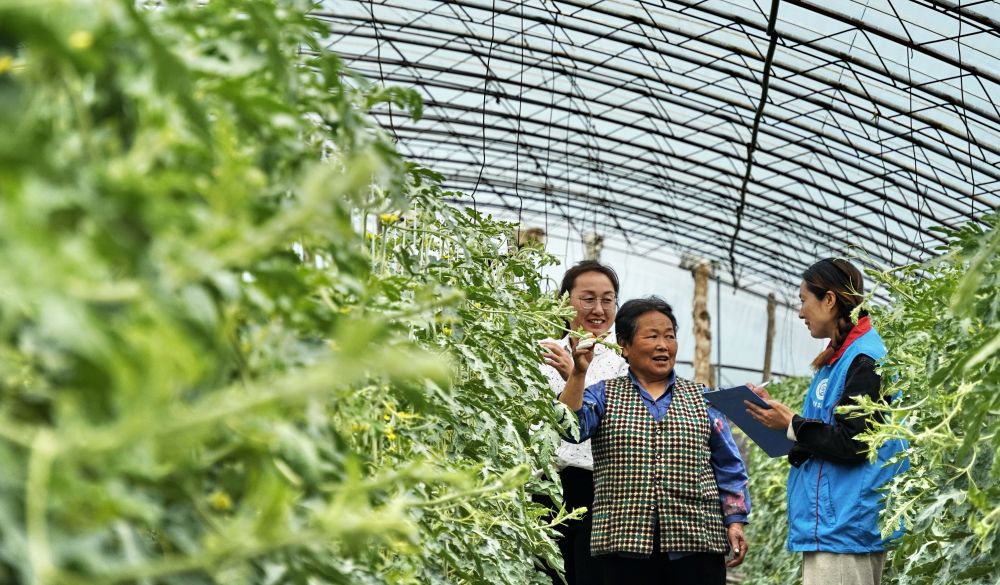 北京市大興區龐各莊鎮李家巷村政務服務站的工作人員來到大棚內為瓜農辦理社保業務(2024年4月9日攝)。新華社記者 李欣 攝