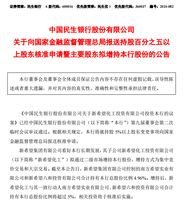 *【環球網財經綜合報道】*11月19日,民生銀行發佈公告,新希望化工投資有限公司(以下簡稱“新希望化工”)計劃通過二級市場增持民生銀行股份,此舉將使新希望化工及其一致行動人合計持股比例超過5%。民生銀行的股東結構迎來新的變化。