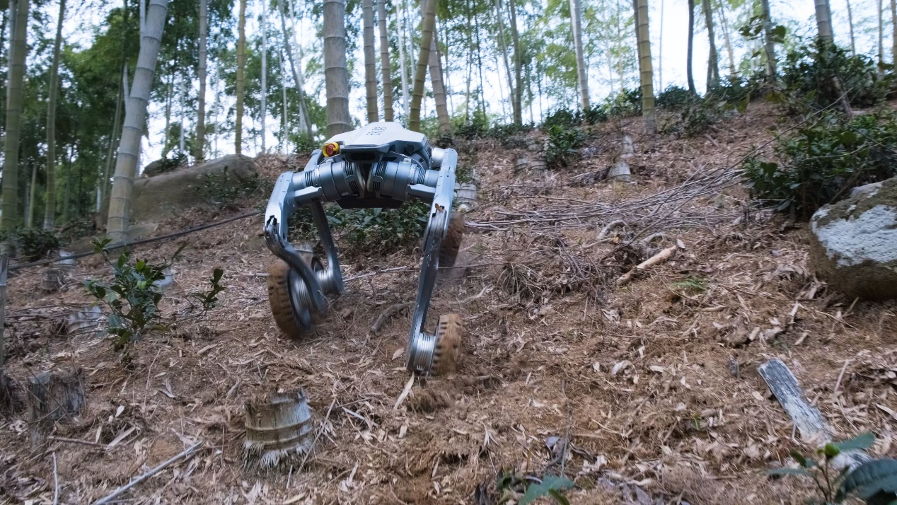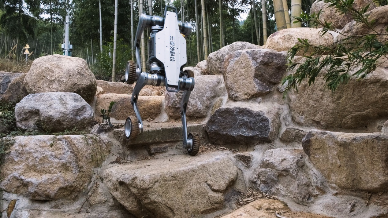 據悉,“山貓”採用獨特的輪足運動形態,將輪式的速度與足式的靈活優勢結合,並藉助雲深處自研的智能運動控制算法,實現“1+1>2”的多地形適配越野能力。“山貓”能夠攀爬22釐米台階以及45°的斜坡,展現出超越傳統四足機器人的越野能力。
