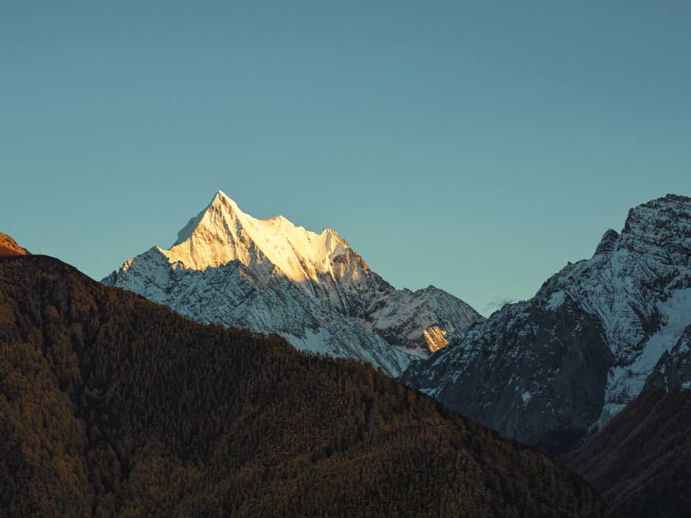 夏諾多吉雪山呈現日照金山景觀。新華社記者 薛晨 攝